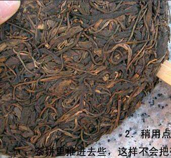 2.稍用点力,把茶刀再往茶饼里推进去些,这样不会把茶饼撬的很散碎。