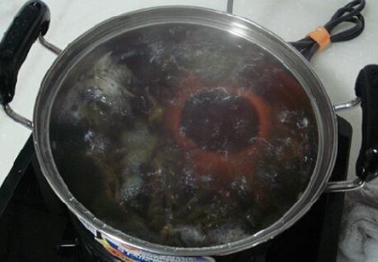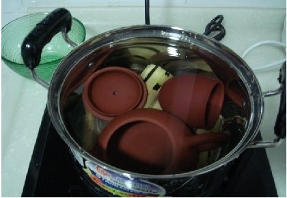 1、热身:将刚买回来的紫砂茶壶,用沸水内外冲洗一次,将表面尘埃除去,将茶壶放进没有油渍的煲,加3倍高度的水煮两小时,这样茶壶的泥土味及火气都会去掉。