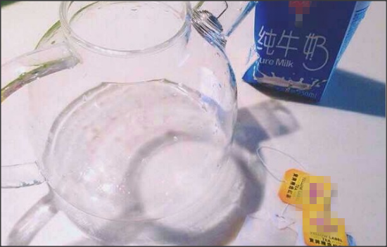 2、牛奶倒进水壶,放入茶包,泡一会儿,时间不要泡太久了。