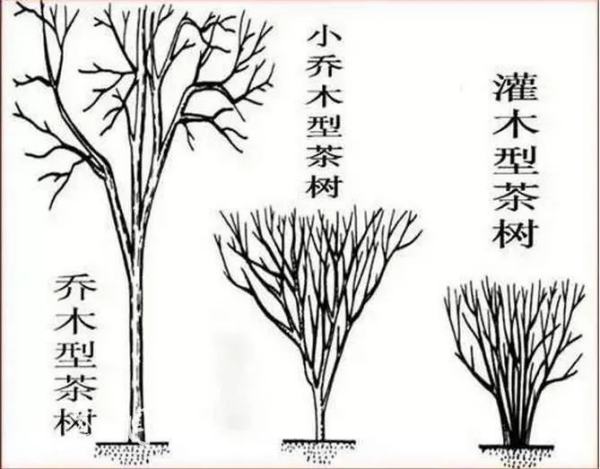 茶树有灌木、小乔木和乔木之分。栽培茶树多为灌木类,主要枝条都由根颈处分出,无明显的主干,树高1~3米。乔木茶树,有明显的主干,分枝部位高,树势高大,达数米至十多米,我国云南等地原始森林中的野生大茶树都属此类。小乔木茶树介于两者之间,分枝部位较高,有明显主干,树势较高,在我国福建、广东较多。