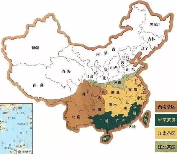 华南茶区主要包括福建和广东中南部,广西和云南南部以及海南和台湾。西南茶区主要包括贵州、四川、重庆、云南中北部和西藏东南部等地。江南茶区是以长江以南茶区为主,包括广东和广西的北部,福建中北部,安徽、江苏、湖北省南部以及湖南、江西、浙江等省。江北茶区位于长江以北,秦岭淮河以南,以及山东沂河以东部分地区,包括甘肃、陕西、河南南部,湖北、安徽和江苏北部以及山东东南部等地。
