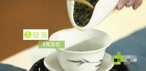 3、投茶:把8g龙井茶倒入到茶碗中,见下图所示。