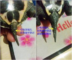 (2)、方法二:在乌龟的繁殖季节,抓住成龟,当它的四肢和头尾皆欲缩入壳内时,用手指使劲按住它的头及四肢,不让它有时间呼吸,此时乌龟泄殖孔内即排出副膀胱水,然后生殖器慢慢地外突,若只向外突出纵列的皱纹内壁者为雌龟;如有一充血膨大呈褐紫色的交接器外突者则为雄龟,如果在交配季节,雄龟还会有乳白色的精液排出。