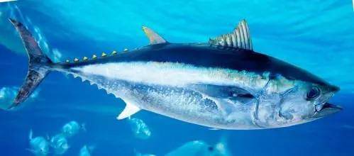 大西洋蓝鳍金枪鱼(学名:Thunnus thynnus):是鲭形目、鲭科、金枪鱼属的海洋动物。体长可达3米,体重约为400千克;一般鲔钓船以钓到150千克左右居多,超过200千克以上皆属于丰收。有记录的最大个体是在加拿大新斯科舍省捕获的,体重679千克。体纺锤形,粗壮,横切面近于椭圆形。吻部圆锥形,口大,上颌骨向后伸达眼睛下缘中下部。尾柄细,两侧各有1大2小隆起脊。体被细小圆鳞,胸部鳞片特大,形成胸甲。背鳍2个,相距很近。胸鳍短,末端到第一背鳍中部。腹鳍尖突分离。第二背鳍和臀鳍后方各有8-10个小离鳍。尾鳍新月形。背部青黑色,腹部银白色,尾柄隆起嵴黑色。第一背鳍黄色或蓝色,第二背鳍红褐色,臀鳍和离鳍暗黄色并带有黑色边缘。