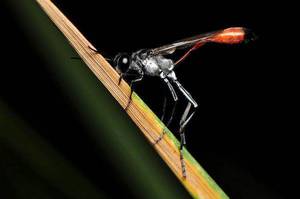 你说的可能是细腰蜂,下面是它的资料: 名称:细腰蜂 英文名:thread-waisted wasp(lchneumon) 膜翅目,又名似我蜂,蜾蠃(Rhynchium bruneum) 自然分类:节肢动物门>> 昆虫纲 >> 膜翅目(Hymenoptera) >>蜜蜂总科>>泥蜂科(Sphecidae>>泥蜂亚科(Sphecinae) 生活习性生活地点 我国境内较常见,遍布黄河长江流域,此外各大洲都有细腰蜂,也常见细腰蜂亚种,喜独栖,一般长2.5厘米以上。因其腹部前端呈杆状,故名细腰蜂。 捕捉昆虫和蜘蛛时,先用针螫,再用钳状上腭揉揑其颈部使之麻痹,将之封入泥室,并在其体内产一卵。泥蜂族这是什么蜘蛛?