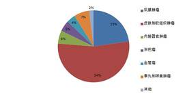 乳腺肿瘤在各个肿瘤中所占的比例为23%,数据来源为德国纳博科临临床检验实验室