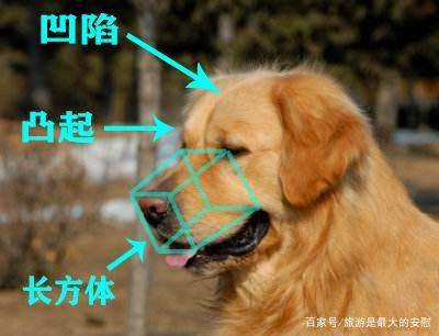 (2)头颅:金毛的头颅有着很明显的特点,第一是它们的脑袋顶部偏后的位置有一个突起的骨骼,这个骨骼是纯种金毛的重要特征。另外就是它们的鼻子正中间,向下凹进,形成一根纵向的直线,这根直线越深越好。