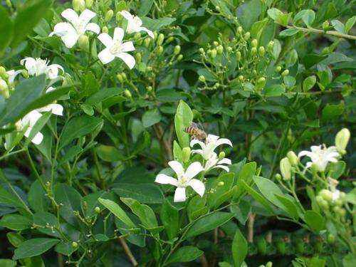 千里香。芸香科九里香属小乔木植物。开白色花,散发浓烈的芳香气味,远距离即可嗅到其香气,故名千里香。别名九里香、满山香、月橘、过山香、七里香等。