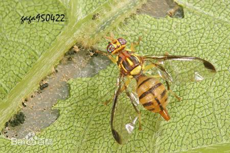 瓜实蝇 〔Bactrocera cucurbitae(Coquillett)〕俗称针蜂,幼虫称瓜蛆,为双翅目实蝇科果实蝇属昆虫[1]。体形似小型黄蜂,黄褐色至红褐色,长7~9mm,宽3~4mm,翅长7mm,雌虫比雄虫略大,初羽化的成虫体色较淡,大小不及产卵成虫的一半。复眼茶褐色或蓝绿色(有光泽),复眼间有前后排列的2个褐色斑;触角黑色,后顶鬃和背侧鬃明显。前胸背面两侧各有1黄色斑点,中胸两侧各有1较粗黄色竖条斑,背面有并列的3条黄色纵纹,后胸小盾片黄色至土黄色;翅膜质,透明,有光泽,亚前缘脉和臀区各有1长条斑,翅尖有1圆形斑,径中横脉和中肘横脉有前窄后宽的斑块;腿节淡黄色。腹部近椭圆形,向内凹陷如汤匙,腹部背面第3节前缘有1狭长黑色横纹,从横纹中央向后直达尾端有1黑色纵纹,2纹形成1个明显的“T”形;产卵器扁平,坚硬。