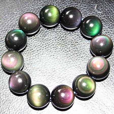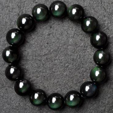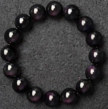 第一,看黑曜石独有的光晕效果,不管是红眼(如下图手链中紫红色的眼状光晕)、绿眼(如下图手链中绿色的眼状光晕)、彩眼(如下图手链中具有明显两种颜色以上的眼状光晕),只要带眼的黑曜石必然是真的,很多不带眼,但有明显光晕效果的黑曜石,不管是单面光晕、双面光晕、强光下的些微光晕,基本也都是真的,这是鉴定黑曜石真假最大的光学特征;如下是典型的黑曜石光晕特征:
