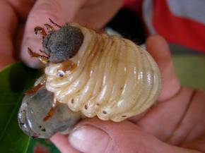 独角仙的幼虫一般叫“鸡母虫”(“锯木虫”的谐音),也有叫蛴螬(很多在地下生活的甲虫幼虫都叫这个名称)的。独角仙的学名叫双叉犀金龟,其幼虫又大、又肥、又白,咬木头时声挺大的。