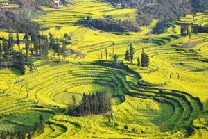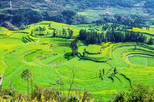 云南的罗平县这里可以看油菜花。因为这里的气候非常独特,所以花期会早一点,二十多万亩的油菜花竞争怒放、流光溢彩,仿佛一片金色的海洋,被风吹过的那油菜花就是海浪,一点一点把这片美景激荡进游客的心中。