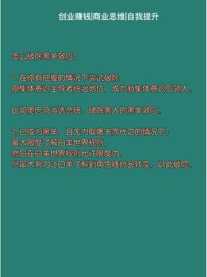 1、在你有把握的情况下尝试破除原集体意识主导者统治地位,成为新集体意识引领人。如奥巴马当选总统,破除黑人的黑羊效应。
