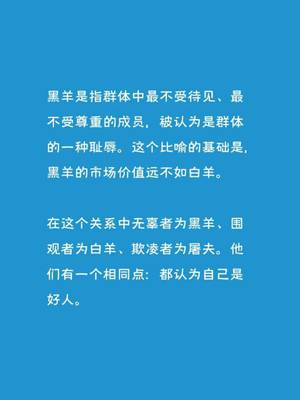 黑羊是指群体中最不受待见、最不受尊重的成员,被认为是群体的一种耻辱。这个比喻的基础是,黑羊的市场价值远不如白羊。在这个关系中无辜者为黑羊、围观者为白羊、欺凌者为屠夫。他们有一个相同点: 都认为自己是好人。