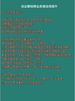 在人性心理中,有这么一个说法,人类所有的趣味都源于对别人的伤害。有句俗话是这么说的,看戏不过瘾就加入其中。所谓的“从众心理”,就由此产生了。其实,校园暴力就是“黑羊效应”的一个缩影。当人出了社会之后,所遇到的种种问题,也跟“黑羊效应”有关。