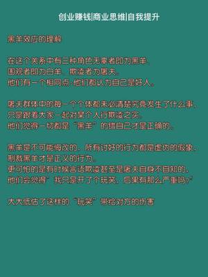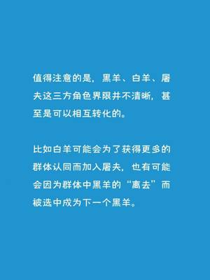 在这个关系中有三种角色无辜者即为黑羊围观者即为白羊、欺凌者为屠夫。他们有一个相同点:他们都认为自己是好人。