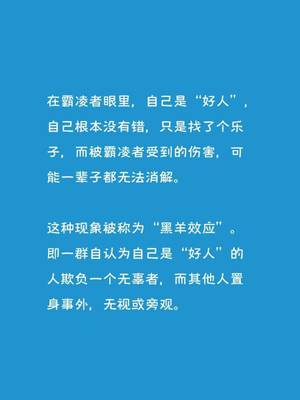 在霸凌者眼里,自己是“好人”,自己根本没有错,只是找了个乐子,而被霸凌者受到的伤害,可能一辈子都无法消解。这种现象被称为“黑羊效应”。即一群自认为自己是“好人”的人欺负一个无辜者,而其他人置身事外,无视或旁观。