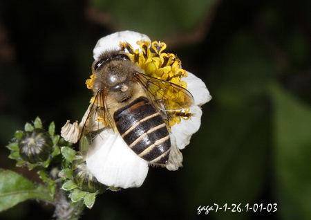 (蜜蜂科)体长 12 - 13 mm,外观近似义大利蜂但本种头、胸背板黑褐色具暗色绒毛,腹背有黑、黄相间的条纹,义大利蜂胸背板浅黄褐色,腹背板颜色较淡,环纹不明显,本种後脚关节有一条白色横斑但有些个体不明显,後脚胫节宽扁凹陷可收集花粉,俗称花篮足。 本种分布於低海拔山区,常见於树洞或岩壁筑巢,一般看到的都是野生,其所酿的蜂蜜较义大利蜂优,成虫全年可见。本属2种,本种又称中华蜜蜂、野蜜蜂、东洋蜂,大半栖息野外,由於较义大利蜂会攻击人类,而且在食粮不足情况下会弃巢到野外另筑新巢,所以人工饲养相对较少。