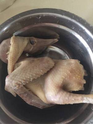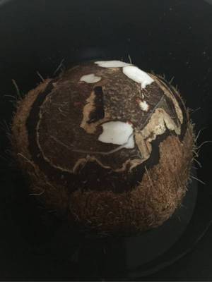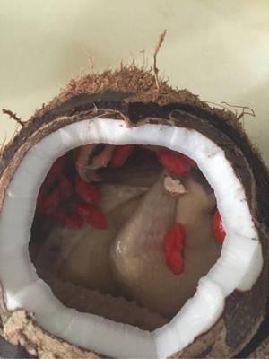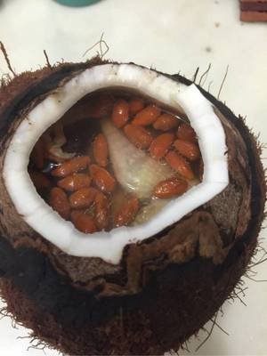 将椰子顶端切开,倒出部分椰子水、将鸽子塞进去,放入红枣、枸杞、桂圆、少许盐、冰糖。