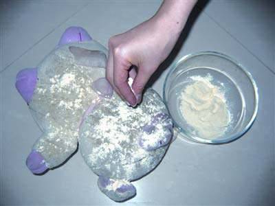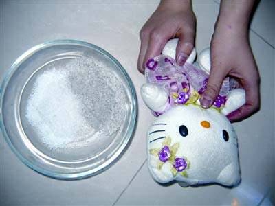 1、粗盐干洗法:先到市场买一袋子粗盐,回家后找一个干净的塑料袋,然后取少量粗盐放在塑料袋中,将要清洗的毛绒玩具放进去,将袋子口系好,开始上下使劲摇晃。大约40次左右,将毛绒玩具拿出来,把表面沾的粗盐粒抖干净,就会发现盐粒变黑,毛绒玩具也比以前干净了许多。