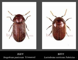 药材甲,是一种世界性的储藏物害虫,食性相当复杂,但主要危害谷物、油料、薯干和药材等储藏物品,也能危害图书,档案等物品。药材甲发育为成虫之后,要在蛹室(茧)内停留约一个星期,然后破蛹室而出。