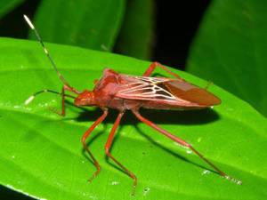 2:如南瓜缘蝽,它的形态特征:身体体长12到16mm,身体颜色色为红褐色至灰褐色不等,它的成虫身体还是比较细长的。它们的前胸背板较宽,头部触角之间有2个小刺,身体末尾基本上是呈三角形的。触角的最后一节为深褐色。足部颜色还是比较浅的,腹部的边缘较宽,幼虫红棕色;触角颜色较深,而且很长。腹部背面具有很大的腺体,幼虫越大该腺体就越明显。危害性:这种蝽对于南瓜的危害性比较大的,一般都是去吸取南瓜的汁液,让南瓜品质变差,甚至从而会导致南瓜果实的死亡。而且又不好去处理这一类的虫子。