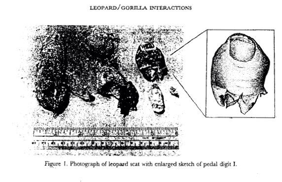 - 1987-1988年,研究人员在中非的豹子粪便中,发现了大猩猩的残骸,其中一只未消化完“脚指头”相当显眼。