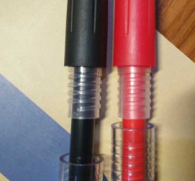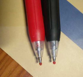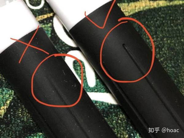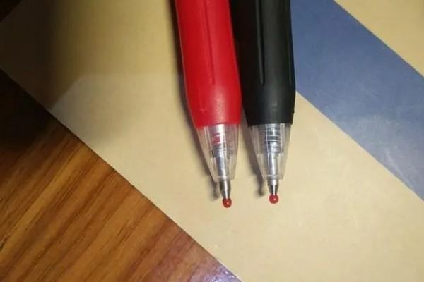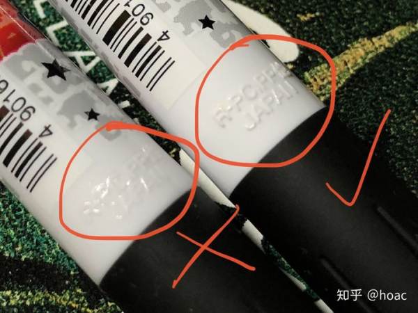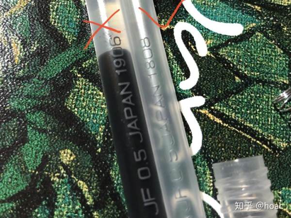 笔芯上的日期和字母如果是灰色(图中的黑色笔芯)那就是正品,如果是偏黑色且字母凹陷较深(图中已经用完的红色笔芯)那就是盗版了。