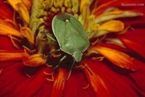 绿蝽,别名稻绿蝽,属于半翅目、蝽科。成虫体长约为1.5~2.2厘米,食性杂,刺吸茄子、番茄、四季豆、毛豆等蔬菜的汁液,造成叶片萎蔫。若虫常在植株被害处附近群集。呈绿色,长盾形。触角丝状5节,前胸背板前缘两侧成角状突出,“肩”的边缘呈黑色,其上有许多黑色粗大刻点。绿蝽的体色随着生长期的变化而变化,逐渐变为全绿色。天敌有平腹小蜂、黄猄蚁、螳螂和蜘蛛等。成虫及若虫有臭腺,遇敌立即放出恶臭。