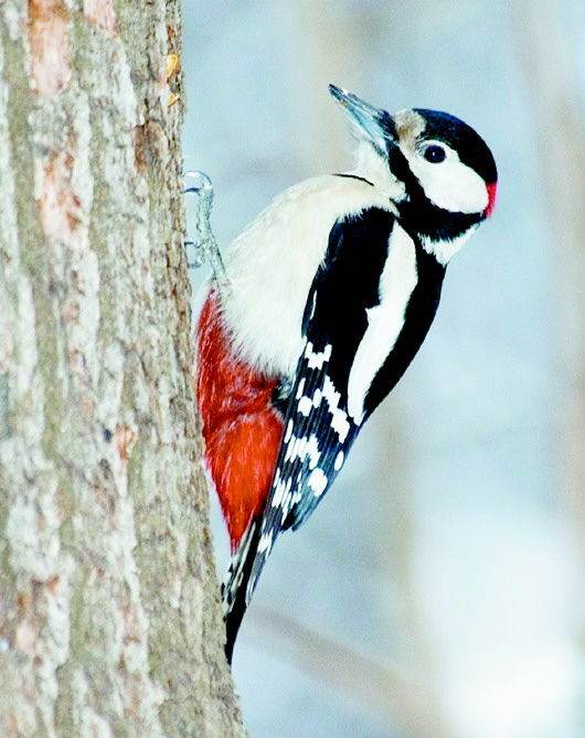 大斑啄木鸟(D. major),长约23公分(9英寸),分布于欧亚大陆西部温带,南到北非森林和果园。
