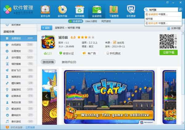 然后通过电脑管家——软件管理——安卓游戏——右上角搜索【城市猫】来找到这款游戏的下载资源。