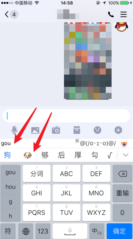 以苹果手机搜狗输入法在手机QQ打出狗头为例子:
