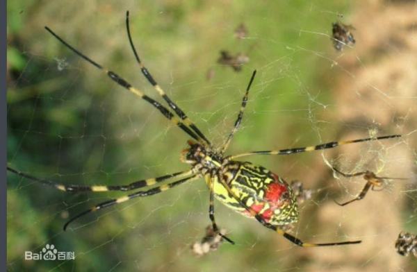 棒络新妇,学名:Nephila clavataL. Koch, 1878,属蛛形纲蜘蛛目园蛛科的一种动物,在山区林间、灌丛间结网,果园以及庭院也常见到。卵袋附于叶的表面和枝干上,毒性很小。