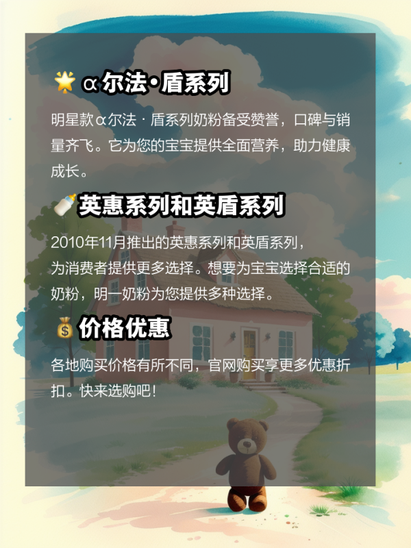 2010年11月推出的英惠系列和英盾系列,为消费者提供更多选择。想要为宝宝选择合适的奶粉,明一奶粉为您提供多种选择。