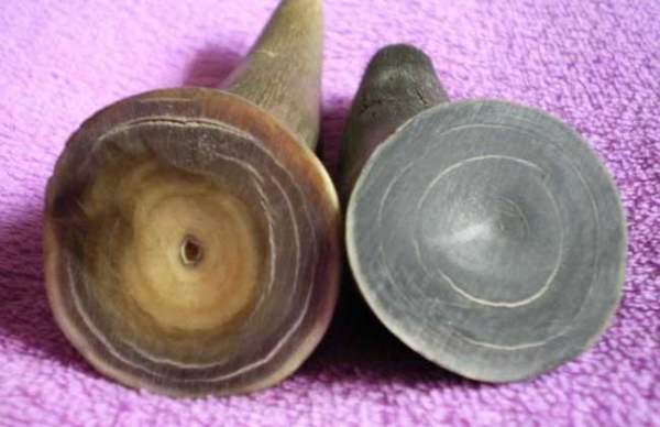 (2)犀角底部的形状——椭圆的是亚洲犀,圆形的是非洲黑犀,近长方的是非洲白犀;