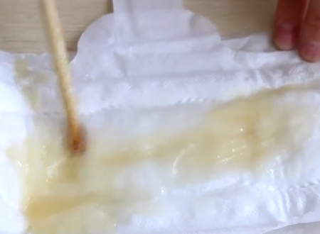 2、然后用木棒将卫生巾上的洗洁精涂抹均匀。