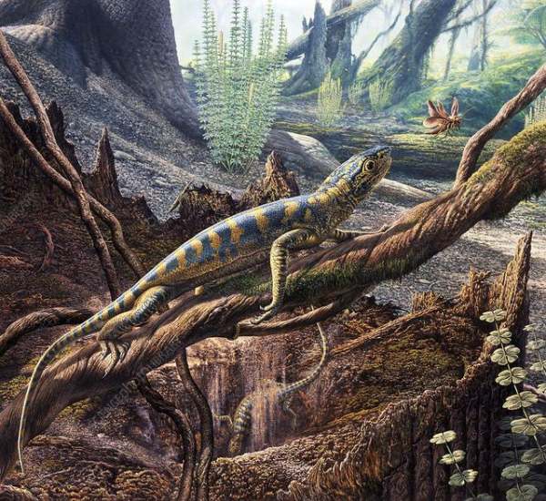 两栖动物拥有肺,可以比昆虫更高效的呼吸,但它们必须回到水中产卵,生殖和发育摆脱不了水的限制。石炭纪晚期,最原始的爬行动物——林蜥诞生了。林蜥是所有爬行动物(包括恐龙)、鸟类和哺乳动物的共同祖先。
