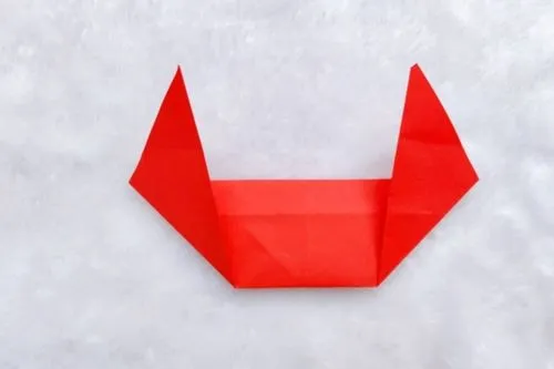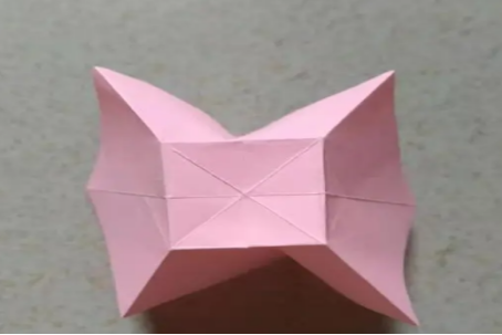 2、整体对半对折,将顶部两角对折。沿折痕将两边收拢起来,两边外翻。顶部两角对折,翻过来拉开就成了蝴蝶结的中间部分。