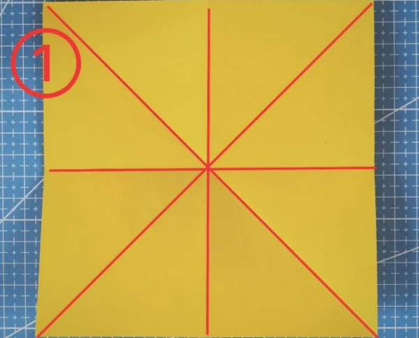 1、把正方形的纸折出一个“米”字折痕。
