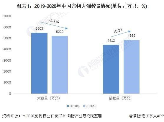 根据《2020宠物行业白皮书》数据显示,2020年全国城镇宠物犬猫数量达到10084万只,比2019年增长1.7%。其中宠物犬数量为5222万只,比2019年下降5.1%;宠物猫数量为4862万只,比2019年增长10.2%,宠物犬首次出现下降,宠物猫数量增幅超过宠物犬的增幅。