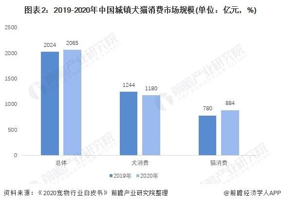 在饲养宠物犬数量下降的同时,宠物犬消费也在下降。2020年宠物犬消费市场规模为1180亿元,比2019年下降5.1%;宠物猫消费市场规模为884亿元,比2019年增长13.3%。从规模上看,宠物犬市场规模仍远高于宠物猫市场规模,但从增速上看,宠物猫消费增速超过犬消费。
