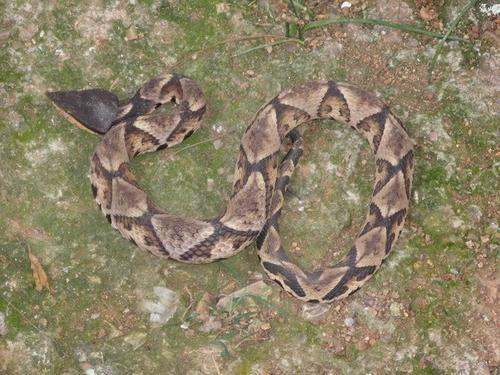 这是尖吻蝮蛇,中国老百姓俗称的五步蛇,剧毒,这种蛇性情凶猛,容易袭击人,平时以蛙类,鸟类和小型哺乳动物为食,在国内的毒蛇致人死亡的事,这蛇占据榜首。尖吻蝮蛇属于国家二级保护动物(不要买卖,违法的)。图片上的这条五步蛇体型很大!在野外环境下很少见了,建议通知当地森林公安部门,妥善处理这条蛇。