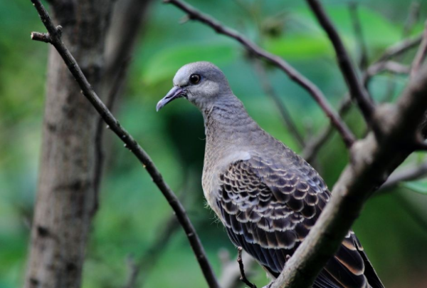 2、山斑鸠。山斑鸠我国斑鸠最常见种类,几乎遍及中国各省区。秋冬季节迁至平原,常与珠颈斑鸠结群栖息。我们平常所说的斑鸠多指山斑鸠。