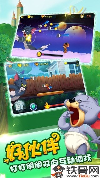 2、小伙伴互动调戏玩法:调皮的Jerry鼠在逃跑的过程中会回头调戏憨厚的Tom猫,向Tom示威,调戏玩法获得的积分和金币会比经典玩法还要多。