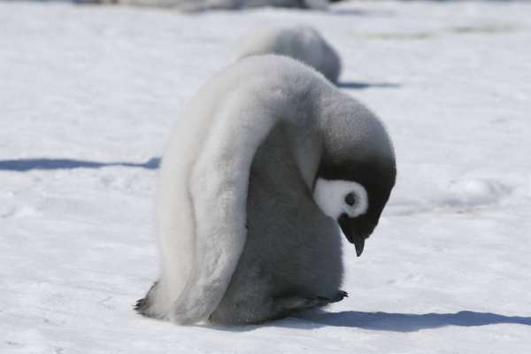帝企鹅虽然是最大的企鹅,但它的幼崽个头并不大,身上的灰色羽毛和脸颊上的白色斑块是识别它们的标志