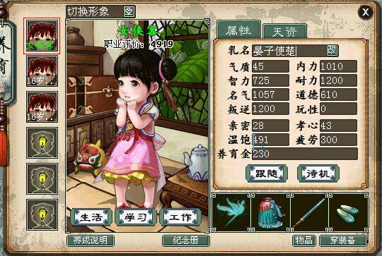 完成30次打手,去皇宫把名气弄到够999,学建筑把耐力弄到够1200,养育金用完了卖萌,疲劳满300以上了可于养育金够360条件下去黑市生活减疲劳撞乞丐给养育金弄道德,黑市生活减智力加玩性,你本就没智力可减给的玩性还可以用版载洗到别的属性上,耐力1200了学音律,快结局时伴读下把叛逆减掉1点让其不够1200,让耐力的1200是唯一的最高,伴读减叛逆后剩余的玩性要留到结局后洗,如果伴读后减了叛逆又洗玩性,玩性就又会被洗到叛逆上而影响结局,孩子装上也不可有叛逆,总之是要出结局时让耐力是唯一的最高,内力和名气够999,打手了30次就是女侠客了,结局在17岁11个月第3次行动结束时产生,结局后再洗玩性把叛逆弄到1200没关系的,结局一旦达成结局后的培养、洗玩性、更换孩子装备带来的孩子属性点变化只会改变评价不会改变已经达成的结局。以后你孩子智力最低是0,所以武器要主加智力的。