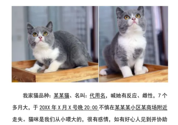 二是在附近张贴一些寻猫启事,最好附上猫咪的图片,以及猫咪特征的文字描述;