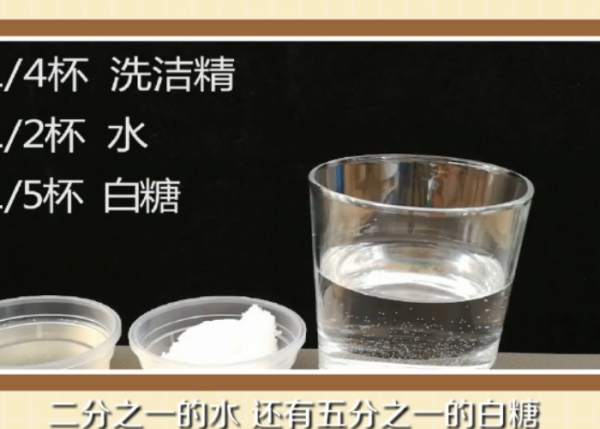 3、准备四分之一杯的洗洁精,二分之一杯的水,还有五分之一杯的白糖。见下图所示: