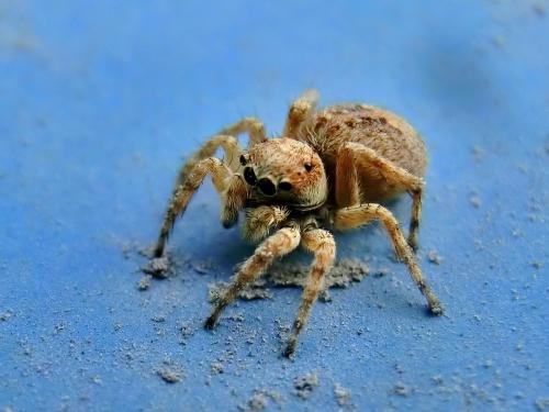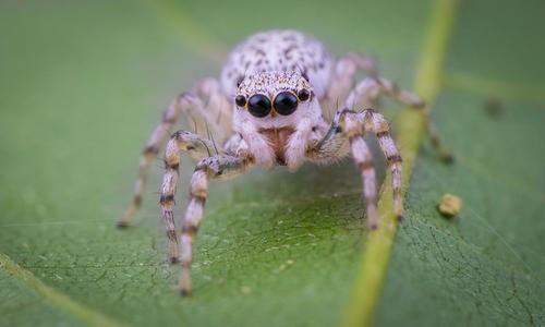 跳蛛, 蜘蛛目的一科,通称跳蛛。体长多数不超过15毫米。体多短粗而稍扁平,步足粗短强壮,善蹦跳,因而得名。跳蛛科是蜘蛛目中最大的科,全球约有3000种。