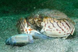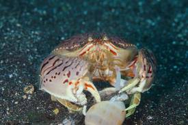 下图为 卷折馒头蟹 Calappa lophos,俗称面包蟹、元宝蟹、喷水蟹、掩面蟹、害羞蟹